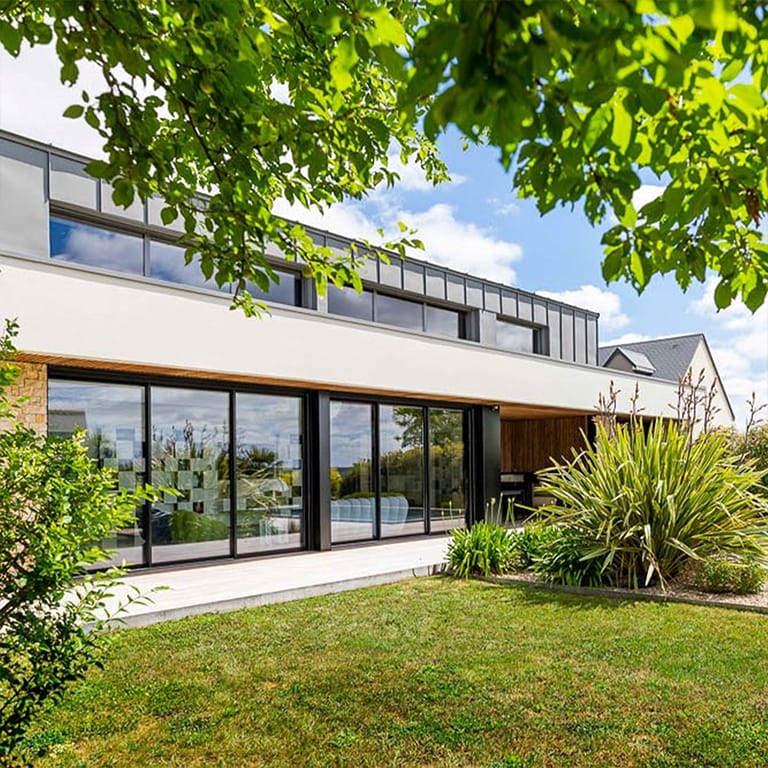 Avec leur design moderne et leur style ""maison d'architecte"", les baies vitrées offrent des performances énergétiques et esthétiques exceptionnelles. Polyvalentes et personnalisables, elles s'intègrent parfaitement à tous les intérieurs.