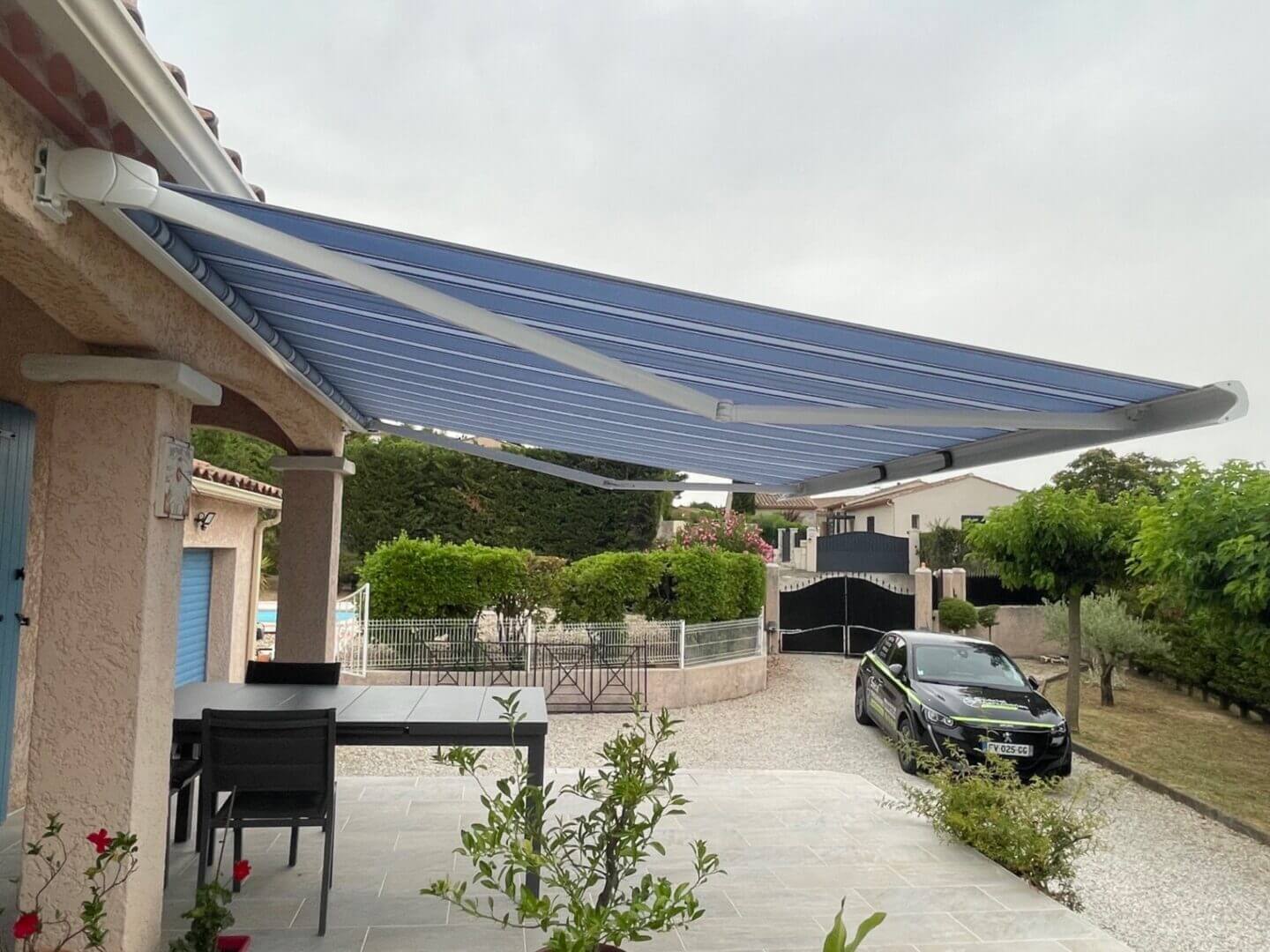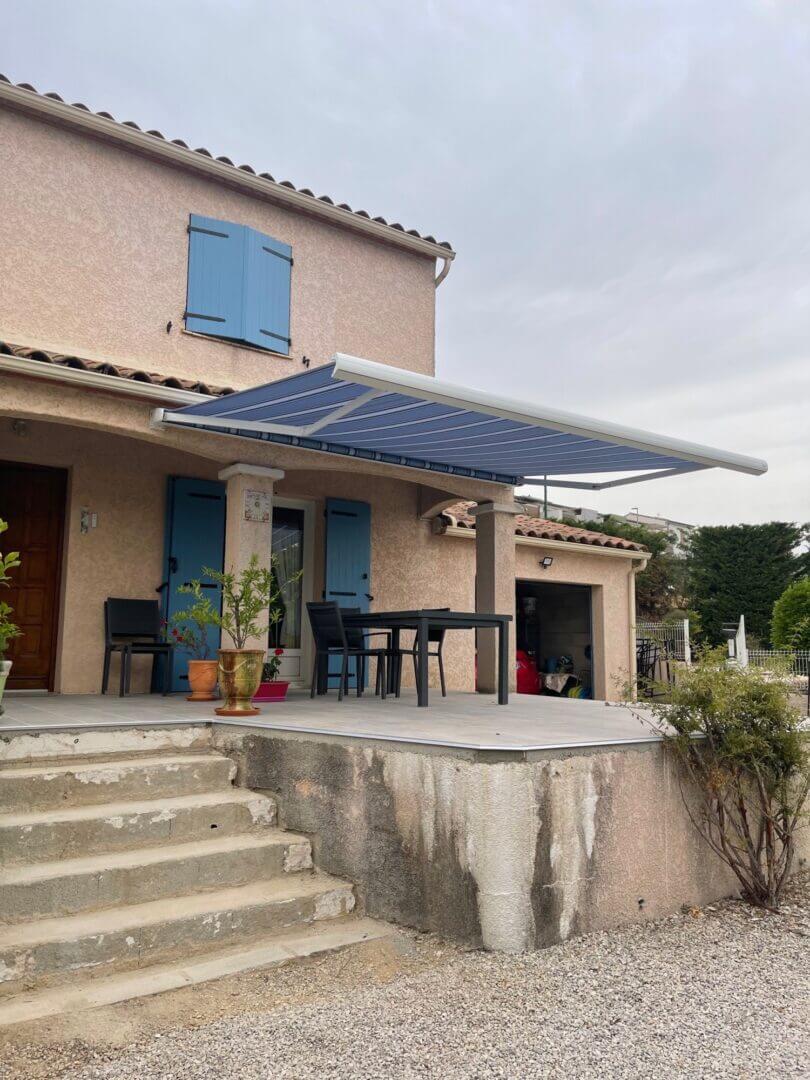 Nos clients ont choisi un modèle, Harol TC 130, contemporain, proposé par Spécial Menuiseries 30 à Milhaud composé d’un coffre en aluminium Blanc et d’une toile bleu rayé ainsi que d’une motorisation, car en plus de protéger sa terrasse du soleil elle souhaitait apporter de la modernité à sa maison.