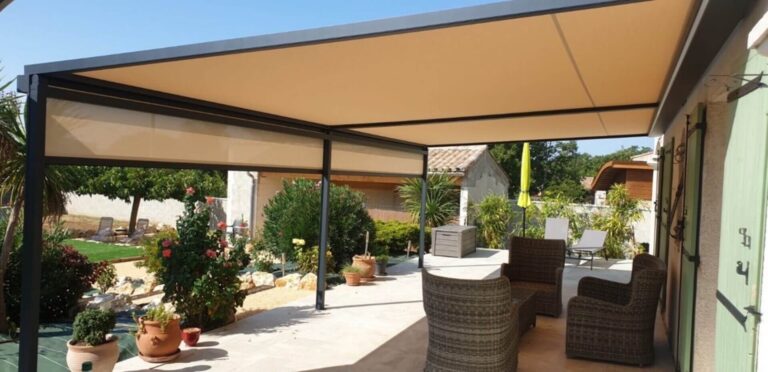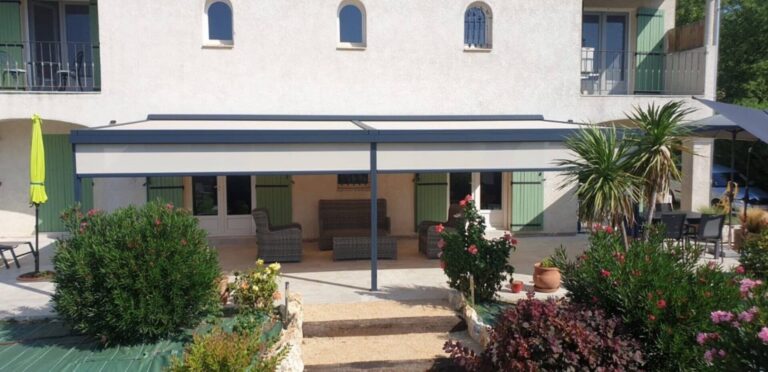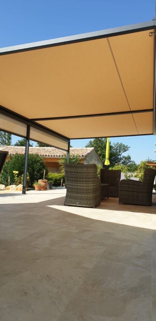 Ils ont choisi le store de terrasse associé à une structure aluminium renforcé. Une véritable pergola toile, tout en gris anthracite avec une toile claire dans le secteur d’Uzès dans le Gard. Le