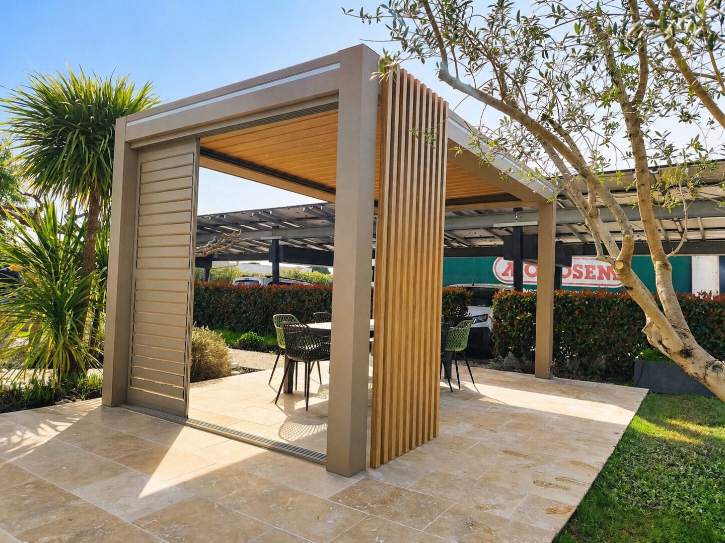 Pergola bioclimatique aluminium imitation bois avec claustra brise-vue à Milhaud