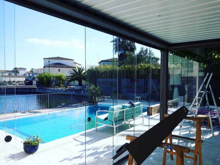 Spécial Menuiseries 34, vous présente une magnifique installation sur mesure d'une Pergolas bioclimatique Lux intégral modèle 2020 avec parois vitrées en verre trempé ainsi que des toiles Screen.