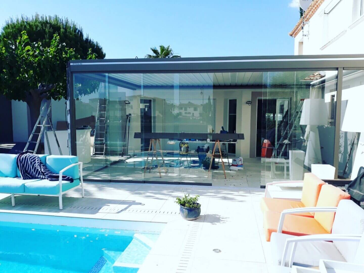 Installation d’une pergolas bioclimatique gris anthracite avec screen et paroies vitrées