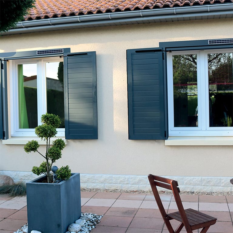 Découvrez nos produits équipés de la technologie solaire : des volets battants disponibles en aluminium . Grâce aux panneaux photovoltaïques intégrés, l'énergie solaire captée permet d'activer la motorisation pour l'ouverture et la fermeture des volets, garantissant jusqu'à 30 cycles de fonctionnement, même sans soleil ! Les volets utilisant la technologie LUMIS® fonctionnent exclusivement avec l'énergie solaire qu'ils captent.